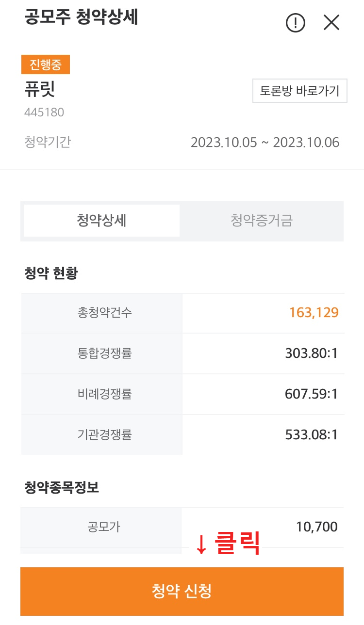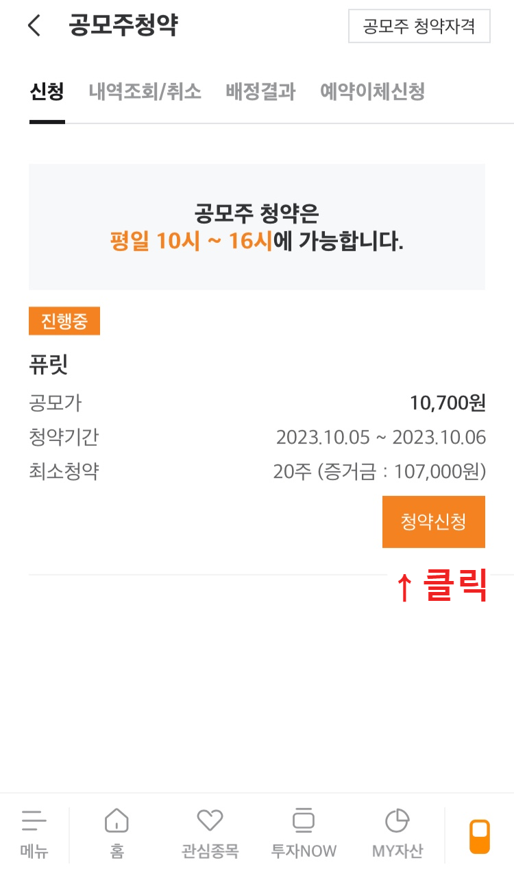 그럼 미래에셋증권의 앱을 들어가 퓨릿의 공모주 청약을 진행해보도록 하겠습니다. 먼저 공모주 청약을 진행하기 위해서는 해당 증권사에 주식을 거래할 수 있는 계좌 개설이 되어 있어야하고, 공모주 청약에 필요한 최소한의 돈이 필요합니다. 이번 퓨릿의 공모주 최소 청약수량은 10주이며, 필요한 청약증거금은 107,000원입니다. 해당하는 금액을 주식 계좌에 넣어두고 청약을 진행하시면 됩니다. 즉, 1) 해당 증권사의 계좌 와 2) 최소 증거금 만 가지고 있다면, 쉽게 청약을 진행 할 수 있습니다.