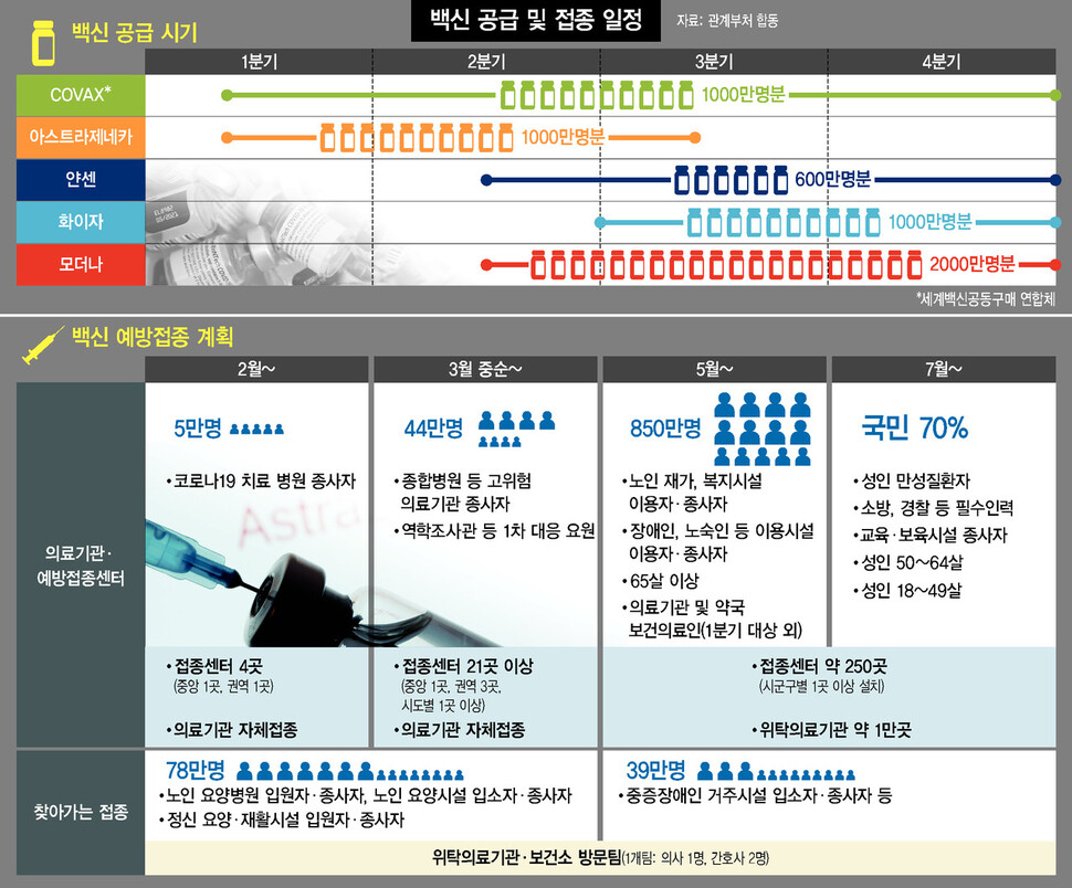 백신은 1분기부터 아스트라제네카 백신 1천만명분, 얀센 600만명분과 모더나 백신 2천만명분은 2분기부터, 화이자 백신 1천만명분은 3분기부터 단계적으로 도입할 예정이라고 합니다. 또한 "코벡스 퍼실리티(세계백신공동구매 연합체)"에서 구입한 아스트라제네카와 화이자 백신 1천만명분이 1분기에 함께 공급될 예정이고, 이에 대한 구체적인 종류, 물량, 시기가 1월말에 발표될 예정이라고 합니다.