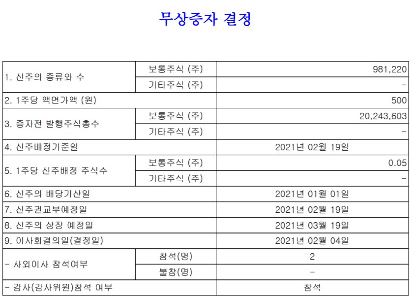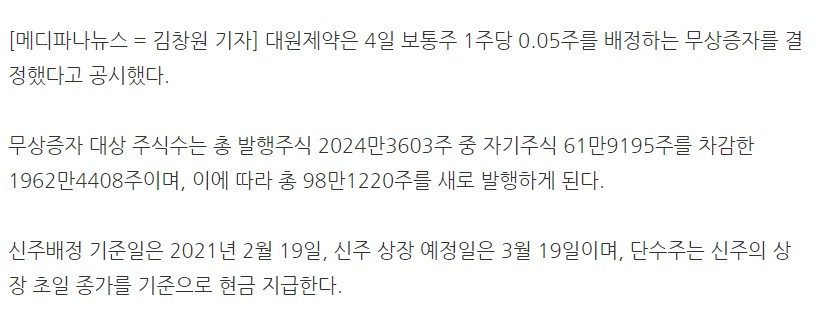 무상증자 예시 ⓒ메디파나뉴스 요약하자면, 대원제약은 1주당 0.05주를 배정하는 무상증자를 진행하고, 신주배정기준일은 2021년 2월 19일이며, 신주 상장 예정일은 3월 19일이라고 합니다. 그리고 단수주는 신주의 상장 초일 종가를 기준으로 주주의 계죄로 현금 지급한다고 했고요.