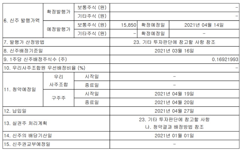 또한 169주에 해당하는 신주인수권을 다른 사람들에게 팔 수도 있고요. 그렇게 청약일이 되고 나면, 1,000주를 소지하고 있던 주주는 약 169주에 해당하는 신주를 추가로 받기 위해 청약일에 약 268만 원(169 x 15,850)의 금액을 해당 주식계좌에 납입해둬야 최종적으로 청약이 완료되고, 그만큼의 주식을 신주 상장일에 교부받게 됩니다.
