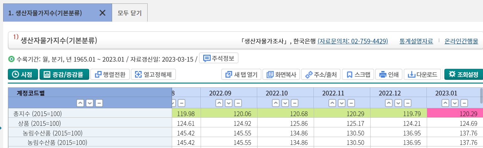또한 생산자물가지수는 한국은행에서 매달 작성하여 발표하고 있지만, 소비자물가지수는 통계청에서 매달 작성하여 발표하고 있습니다. 이는, 은행이 기업 간의 거래내역을 쉽게 확인할 수 있기 때문이 아닐까 싶은데요.